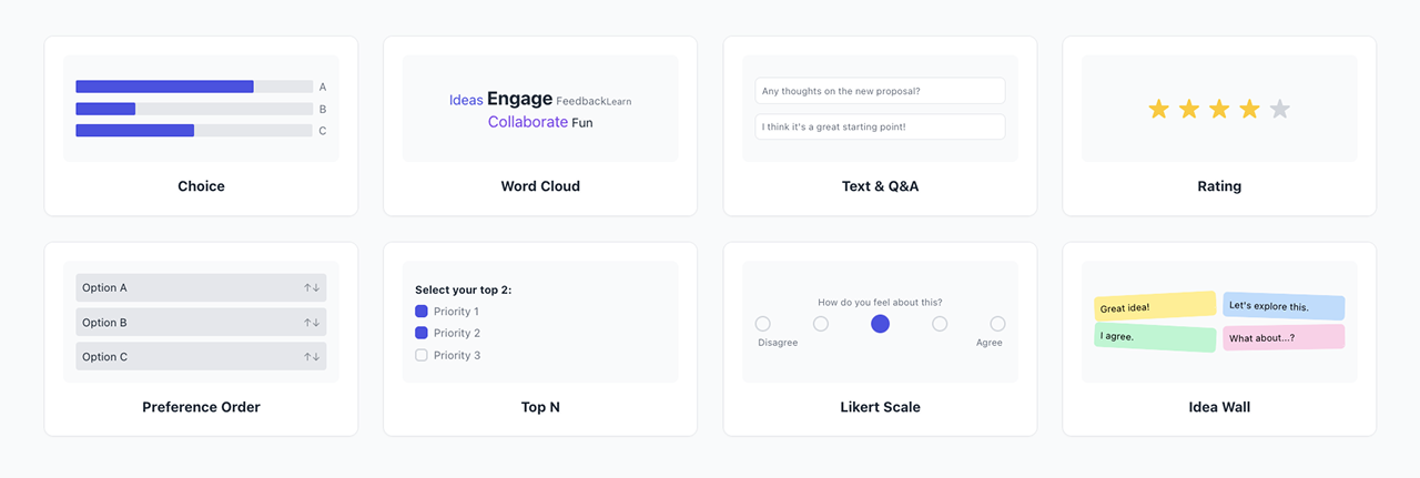 Gather ideas, suggestions, opinions, and examples from every participant in real time.